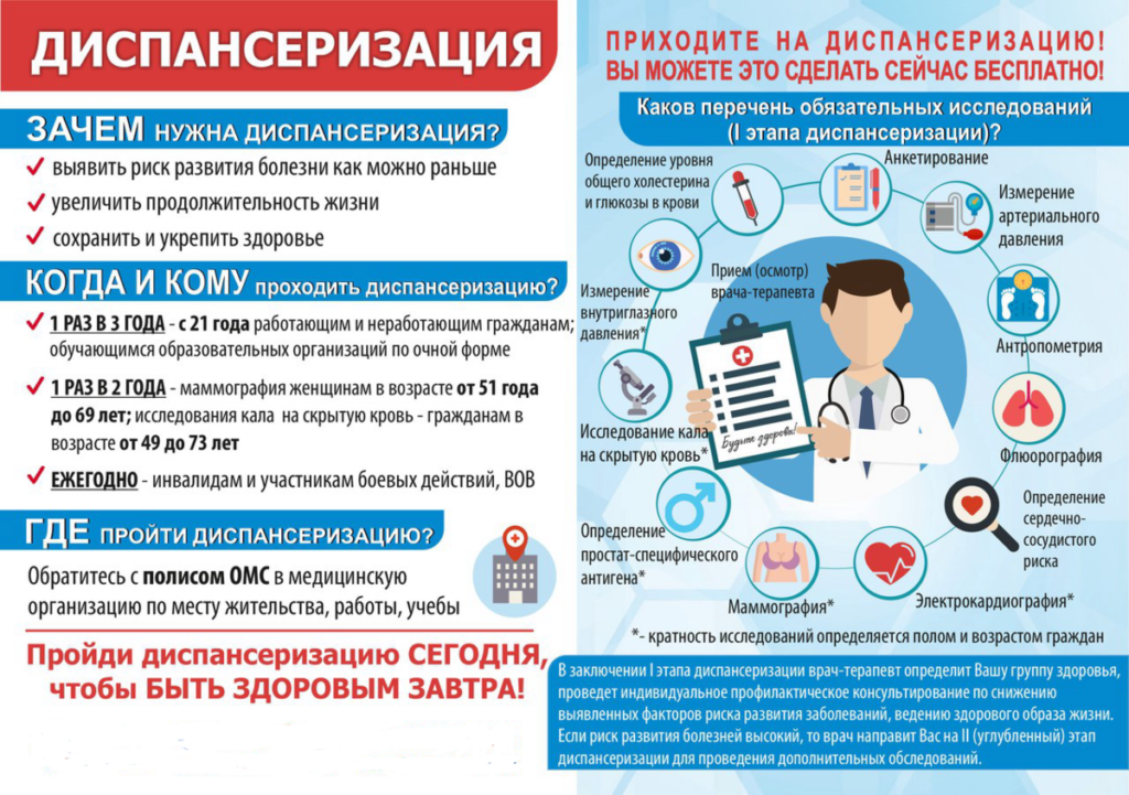 «Для бесплатного чекапа достаточно прийти в поликлинику по месту прикрепления. Диспансеризация проводится один раз в три года в возрасте от 18 лет до 39 лет включительно и ежегодно в возрасте от 40 лет» — рассказывает замглавврача Хасавюртовской ЦГБ по поликлинической работе Асият Залимханова. Пройти обследование можно не только в поликлинике. Специалисты выезжают с мобильными пунктами поближе к населению. Размещение выбирают в наиболее удобных для жителей локациях, например, вблизи популярных торговых точек. Диспансеризация проводится в два этапа. Первый этап включает: ● измерение внутриглазного давления ● общий анализ крови ● скрининг на выявление злокачественных новообразований шейки матки ● скрининг на выявление рака молочных желез для женщин в возрасте от 40 до 75 лет ● скрининг на выявление рака предстательной железы (для мужчин в возрасте 45, 50, 55, 60 и 64 лет) ● скрининг на выявление рака пищевода, желудка и двенадцатиперстной кишки (для пациентов 45 лет) ● скрининг на выявление рака толстого кишечника и прямой кишки — для граждан в возрасте 40-64 лет исследование кала проводится раз в два года, в возрасте 65-75 лет – ежегодно По результатам первого этапа диспансеризации — прием терапевта. Проводится осмотр на выявление визуальных и иных локализаций онкозаболеваний, в частности, осматриваются кожные покровы, щитовидной железы, лимфоузлов. В ходе приема врач может поставить диагноз, выдать направление к специалистам и назначить дообследование в рамках второго этапа диспансеризации. Второй этап диспансеризации (при наличии медицинской рекомендации) предусматривает: ● осмотр неврологом ● хирургом или урологом ● колопроктологом ● акушером-гинекологом ● офтальмологом ● отоларингологом; ● дерматовенерологом, включая проведение дерматоскопии ● УЗИ сосудов головы и шеи ● проведение колоноскопии ● эзофагогастродуоденоскопию (исследование верхних отделов желудочно-кишечного тракта (пищевода, желудка и двенадцатиперстной кишки) ● рентгенографию легких, компьютерную томографию легких ● спирометрию (исследование для измерения объема легких) ● исследование уровня гликированного гемоглобина в крови при подозрении на сахарный диабет «По результатам второго этапа диспансеризации проводится прием терапевтом. Пациента могут направить на дообследование, не входящее в объем диспансеризации, в том числе к врачу-онкологу, а также для получения высокотехнологичной медицинской помощи» — подчеркнула Залимханова.