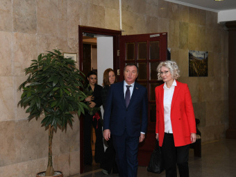 Делегацию встретил Председатель Народного Собрания РД Заур Аскендеров. Вице-спикера Государственной Думы и сопровождающих ее членов делегации также приветствовали депутат Госдумы Мурад Гаджиев и министр по туризму и народным художественным промыслам РД Эмин Мерданов.