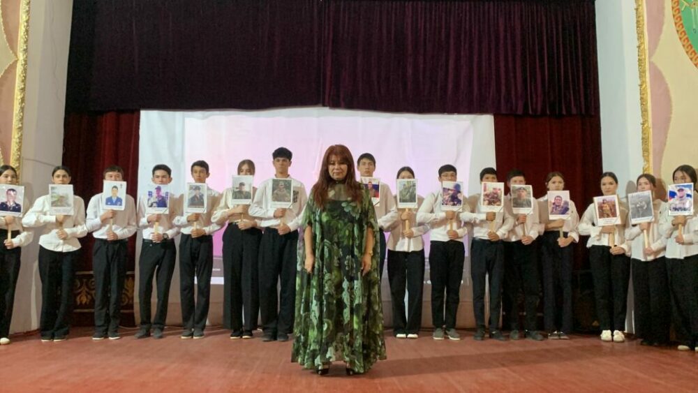 Народная артистка РД Фатима Нурлубаева исполнила песню «Мама потеряла сына на войне». При исполнении этой песни юнармейцы школы имени Кадрии внесли в зал портреты погибших земляков на СВО.